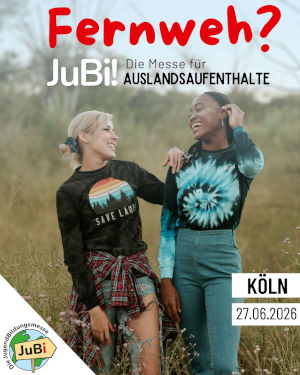 Am Samstag, den 27.06.2026, findet im Bürgerhaus Stollwerk die JugendBildungsmesse JuBi statt. Auf der Messe zu Auslandsaufenthalten informieren Veranstalter:innen, Bildungsexpert:innen und ehemalige Teilnehmer:innen über Programme wie Schüleraustausch, High School, Sprachreisen, Work & Travel, Au-Pair, Gastfamilie werden in Deutschland, Homestay, Praktika, Studium im Ausland und internationale Freiwilligendienste. Auch zu Stipendien und weiteren Finanzierungsmöglichkeiten wird beraten. Die JuBi richtet sich in erster Linie an Schüler:innen der Klassen 7 bis 13, ihre Eltern und Lehrer:innen. Die Messe findet in der Zeit von 10 bis 16 Uhr statt. Der Eintritt ist frei. Weitere Infos und die Ausstellerliste: weltweiser.de |
